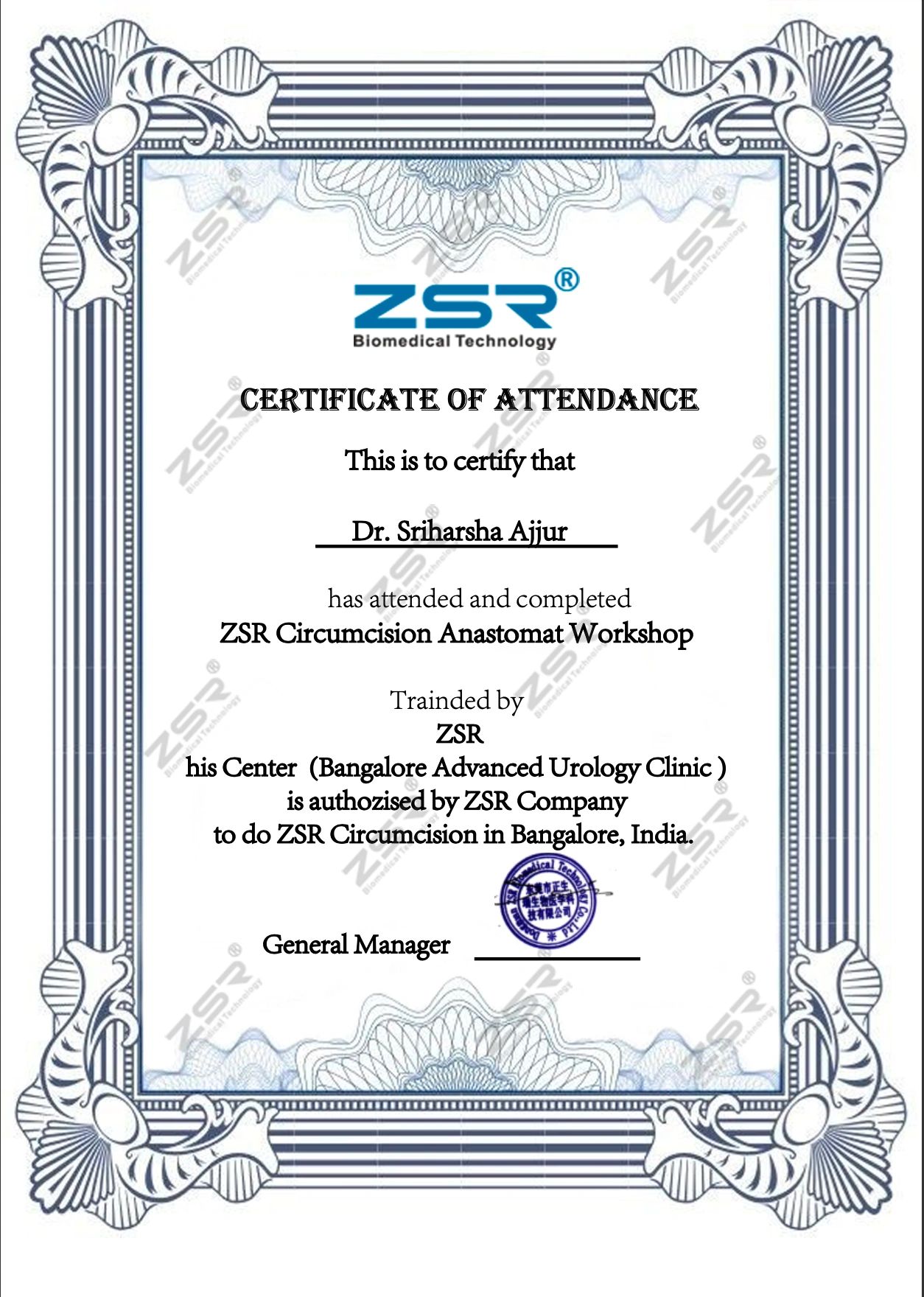 ZSR Circumcision is a revolutionary new technology for trating phimosis . It is a surgical stapler device for circumcision developed by ZSR Biomedical Technology company in China. Dr Sriharsha Ajjur is trained in ZSR circumcision . He has introduced ZSR Circumcision in Bangalore , India.
